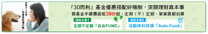 定期不定額「自由FUND」:除保留定期定額分散風險的優點,投資策略更創新!提供三大靈活投資策略供投資人自由選擇, 滿足面對不同行情時的策略需求。策略一、逆勢加碼:股市下跌時加碼投資;策略二、順勢加碼:多頭時追漲強勢股市; 策略三、自由設定:在盤整醞釀向上動能時增加累積單位數。並搭配客觀的「均線法則」, 亦即基金淨值的週均線及年均線走勢做為加減碼的指標,避免因人為主觀判斷而錯失投資機會。 more...