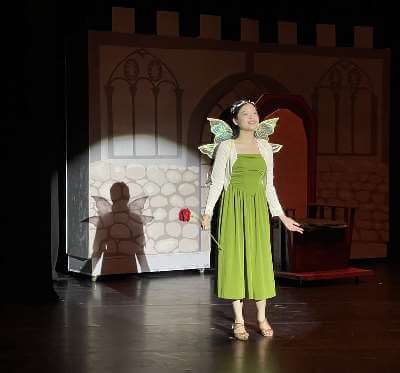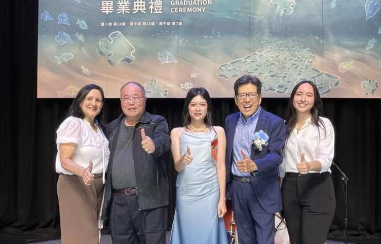 | ▲沈〇華一家人與嚴長壽董事長合影。 | ▲沈〇華在畢業戲劇公演演出照。 |